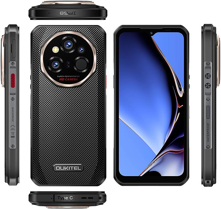 يأتي جهاز Oukitel WP55 Ultra بتصميم قوي ومتين يعكس طابعه العملي. الأبعاد الكلية للهاتف هي 172.2 × 81 × 15.3 مم ويبلغ وزنه 367.6 جرام، مما يجعله ثقيلاً بعض الشيء مقارنة بالهواتف الأخرى ولكنه يمنحه أيضًا شعوراً بالصلابة.